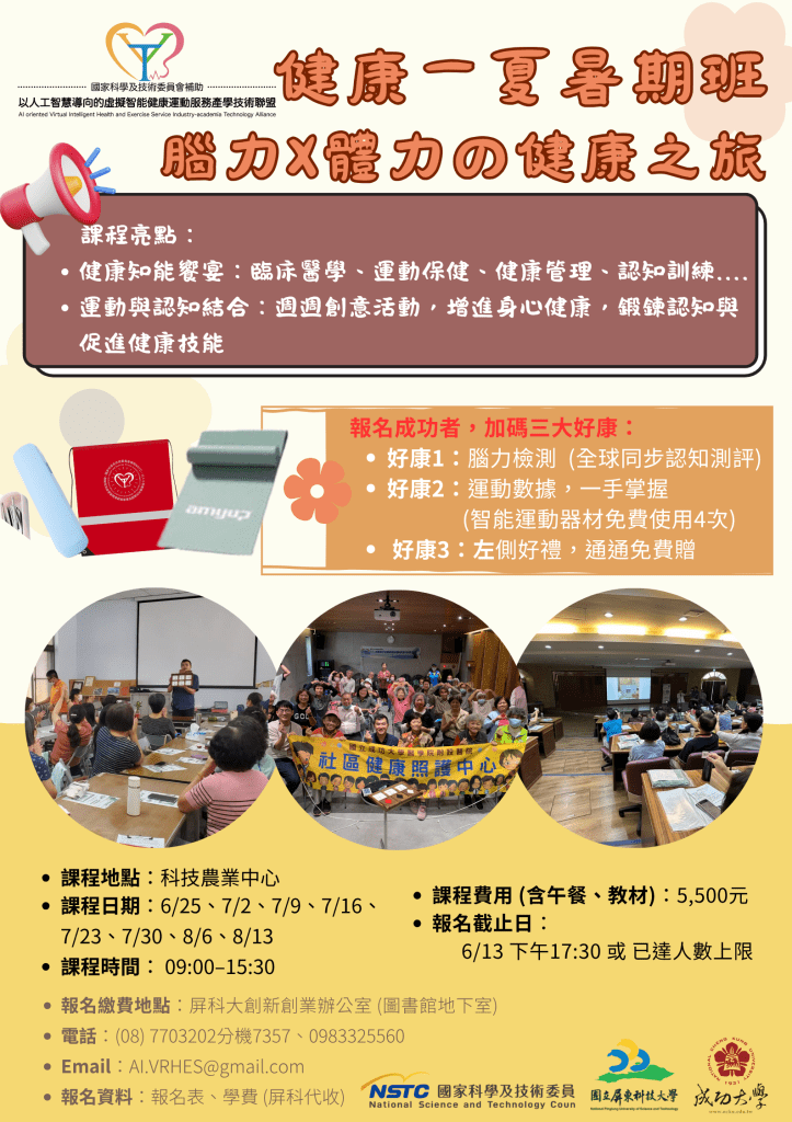 國科會補助之以人工智慧導向的虛擬智能健康運動服務產學技術聯盟(簡稱「AI虛擬智能健康運動服務產學小聯盟」),本聯盟將於暑期開設運動與健康促進相關議題的課程,協助高齡者提升身心健康。在這個課程中,擬每週來自不同領域的專家學者,為您帶來豐富的運動與健康促進知識。在課程中,也特別設計了融合認知訓練與運動的互動活動,幫助您提升身體與大腦的靈活度,開啟更健康的生活模式。